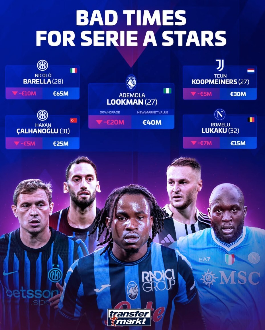 意甲身价跌幅榜:卢克曼跌幅最大,国米3人下跌1000万