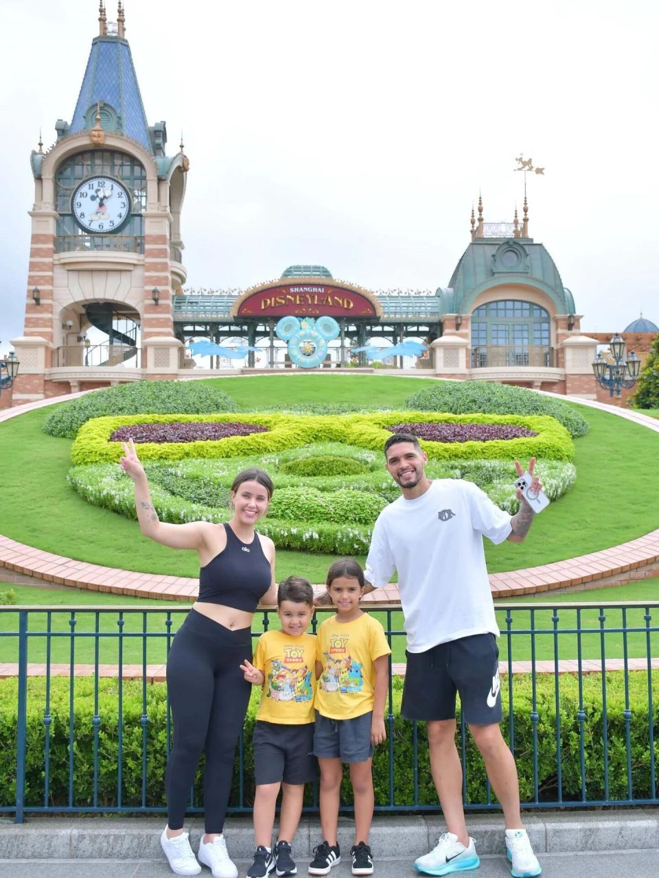 ▲里切利偕未婚妻娜塔莉亚·吉梅内斯和女儿、儿子打卡上海迪士尼度假区。