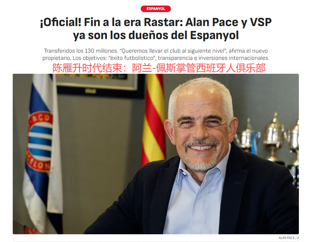 这则通告,意味着55岁的陈雁升不再担任西班牙人俱乐部主席,西班牙人的10年中资俱乐部身份,已经画上句号。