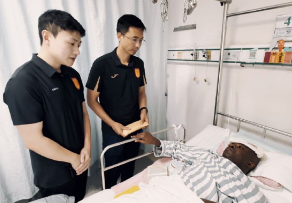 而在阿萨莫阿入院后的第4天,铜梁龙俱乐部总经理李平、总经理助理姚晟一行专程前往广西医科大学第一附属医院,探望并慰问了正在医院休养的阿萨莫阿。李平向阿萨莫阿送上了慰问金和鲜花。