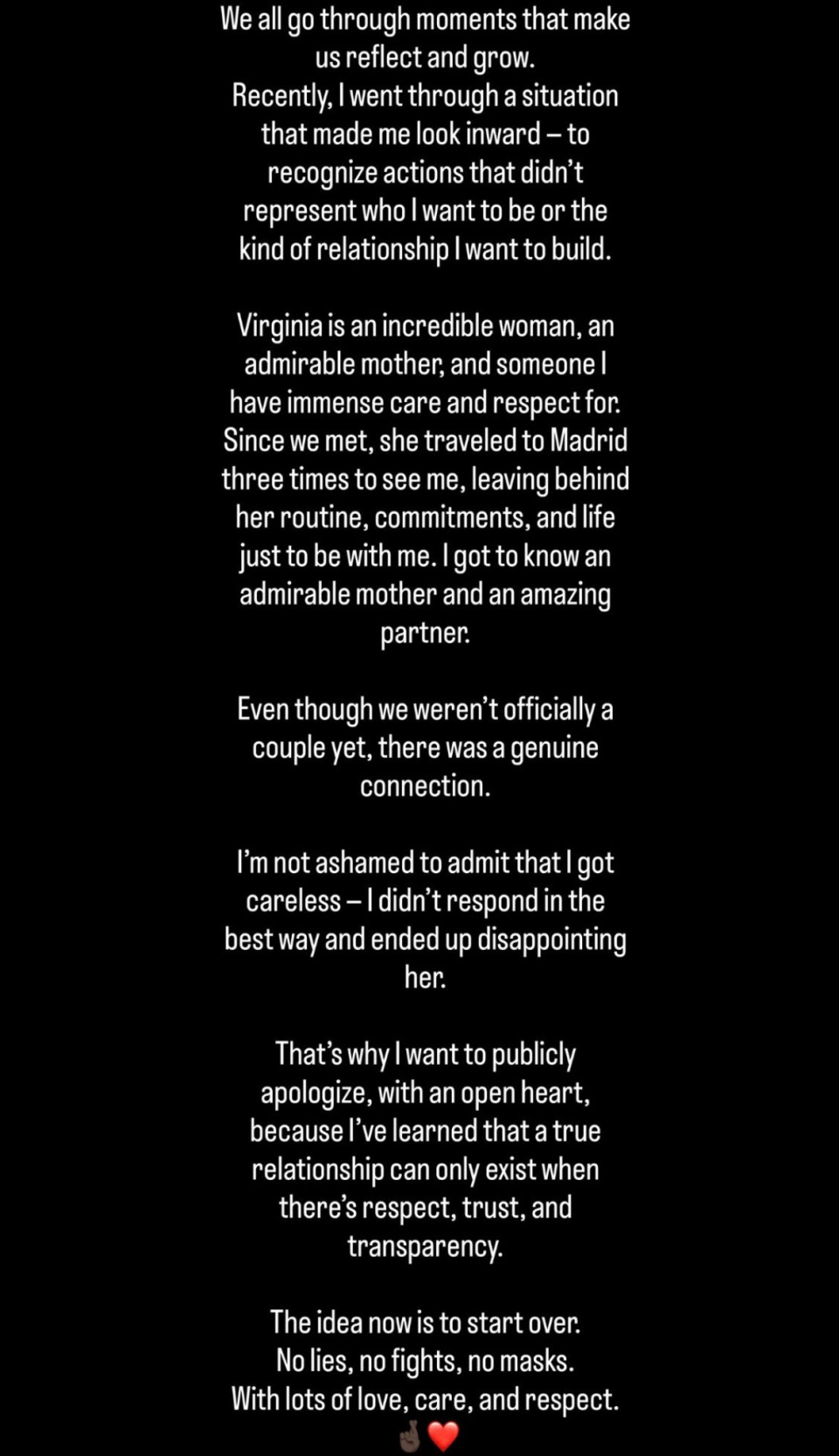 “正因如此,我想公开道歉,真诚地表达歉意。我明白,真正的关系建立在尊重、信任和坦诚之上。现在,我只想重新开始——没有谎言,没有争吵,没有伪装,只有爱、关怀和尊重。”