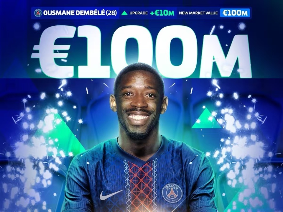 法甲球员身价更新:大巴黎包揽前11名,登贝莱重返亿元俱乐部!
