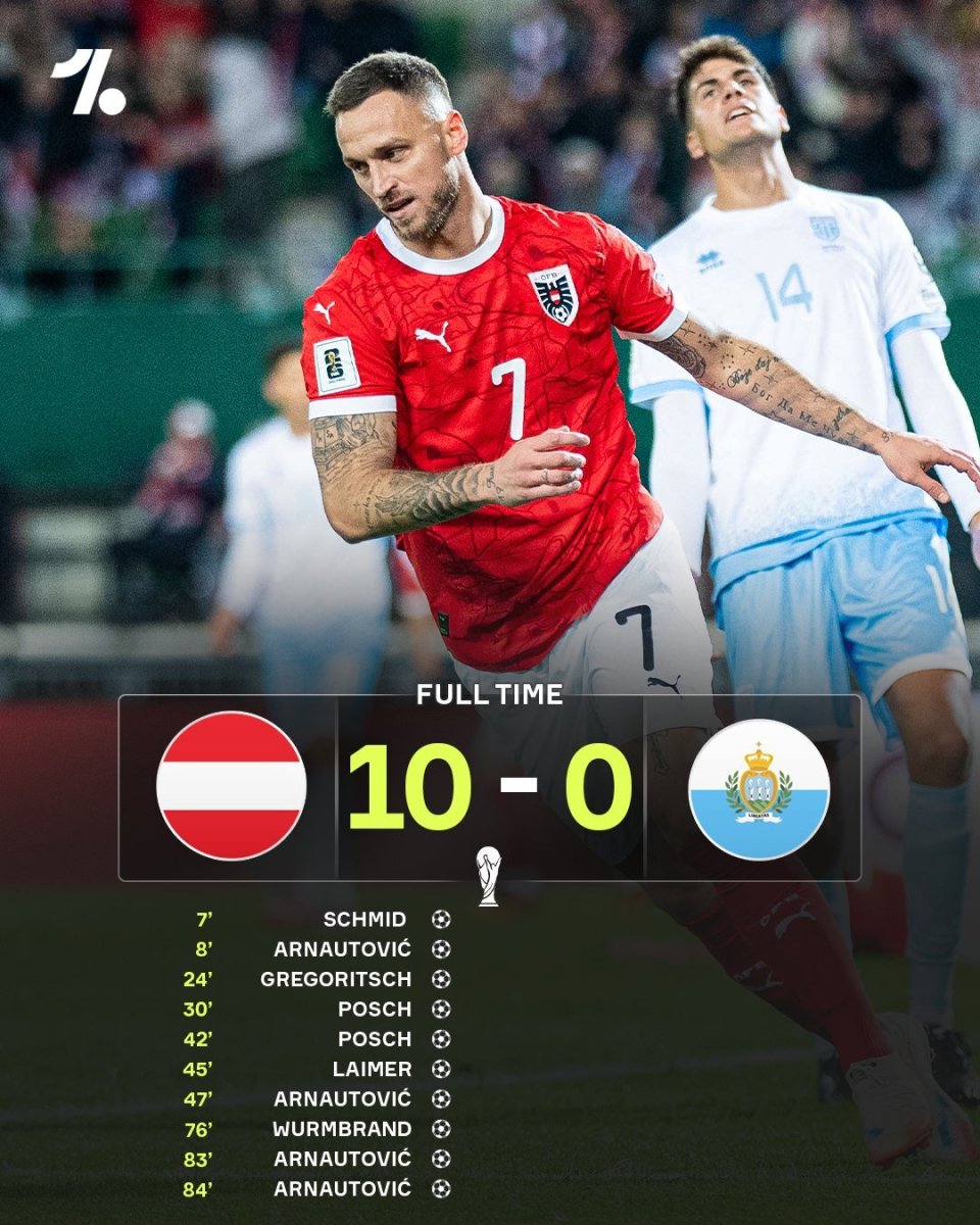 世预赛欧洲区H组第7轮,奥地利10-0狂胜圣马力诺,5连胜领跑。阿瑙托维奇大四喜,成为队史射手王,圣马力诺6连败、只进1球狂丢28球,排名倒数第一。[详情]