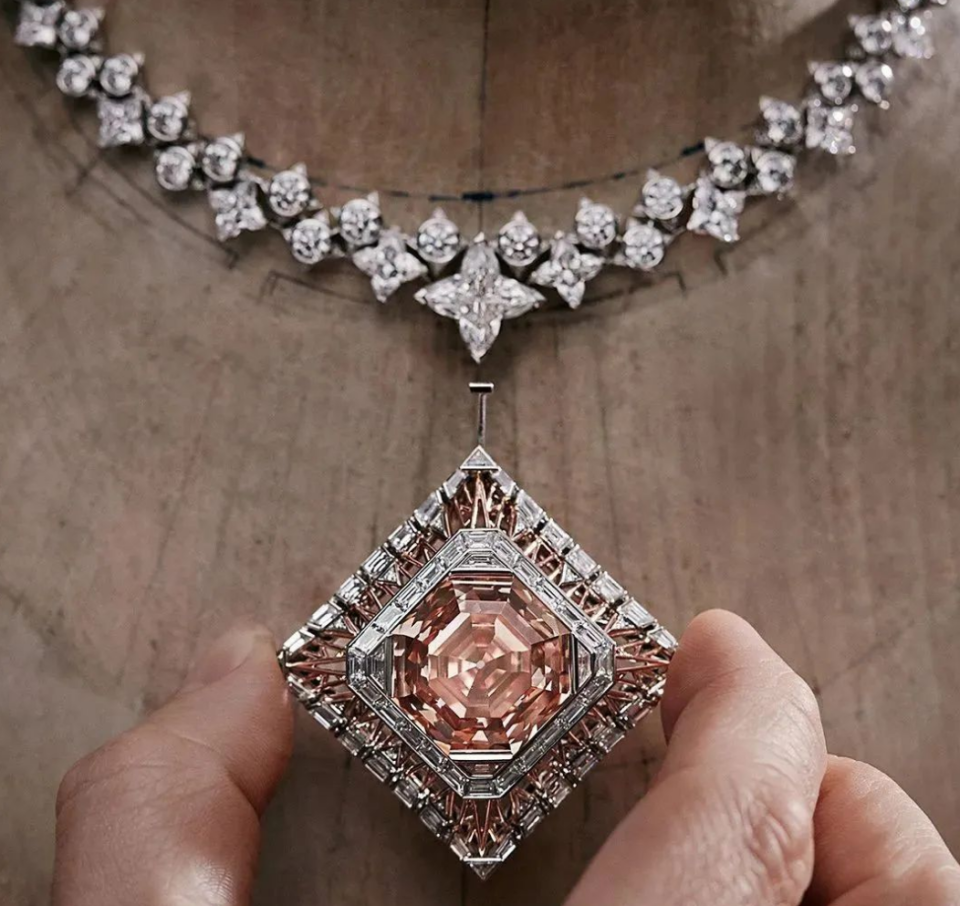 澳门夏先生于柘.光定制了“CœurdeParis”同款圣心棕粉钻项链,“原款56克拉,我让设计师缩小了尺寸,不过VVS净度、D色、3EX切工,加上IGI一钻一码鉴定,品质和外观都超棒,只花了不到8万,我十分满意。”这般价格与品质,在欧美钻石市场几乎难以找到。
