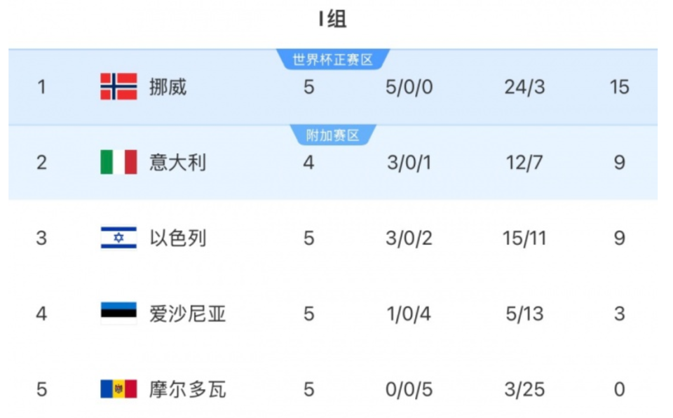 目前,世预赛欧洲区I组挪威5场比赛拿满15分领跑,状态之出色不必多言。不过他们是多赛1场的状态,目前领先第二名意大利6分,外加16个净胜球。意大利4场9分、以色列5场9分排在他们后面。在改制后每组只有第一名才能直通世界杯,因此,挪威跟意大利之争(包括以色列)堪称是有你没我,不能有半分的低估。