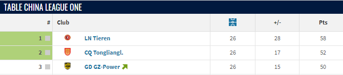 25轮之后,辽宁铁人以55分领跑积分榜,重庆铜梁龙、广州豹分别以49分、47分排名第2、3位,而排名第四位的延边龙鼎只拿到了42分。