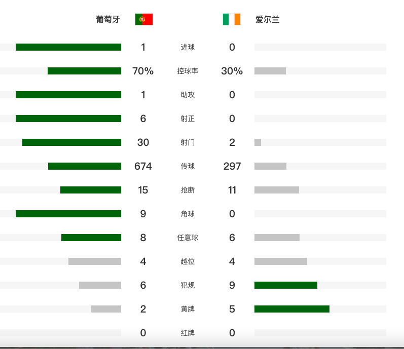 北京时间10月12日凌晨,美加墨世界杯欧洲区预选赛继续进行,葡萄牙坐镇主场迎战爱尔兰。上半场比赛,C罗的射门击中立柱,B席面对空门补射踢呲,两队半场射门13-1,比分却是0-0。下半场,C罗主罚点球被凯莱赫扑出。伤停补时阶段,鲁本·内维斯头球绝杀。最终,FIFA排名第5的葡萄牙主场1-0战胜爱尔兰,迎来世预赛3连胜。