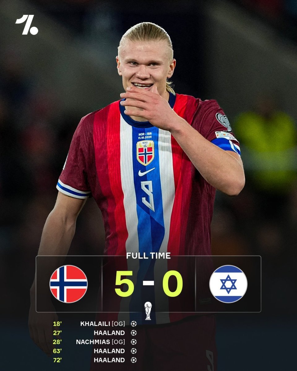世预赛欧洲区I组第7轮,挪威5-0大胜以色列,豪取6连胜。哈兰德开场两度罚丢点球,但上演帽子戏法,努萨造哈莱利乌龙+助攻双响。