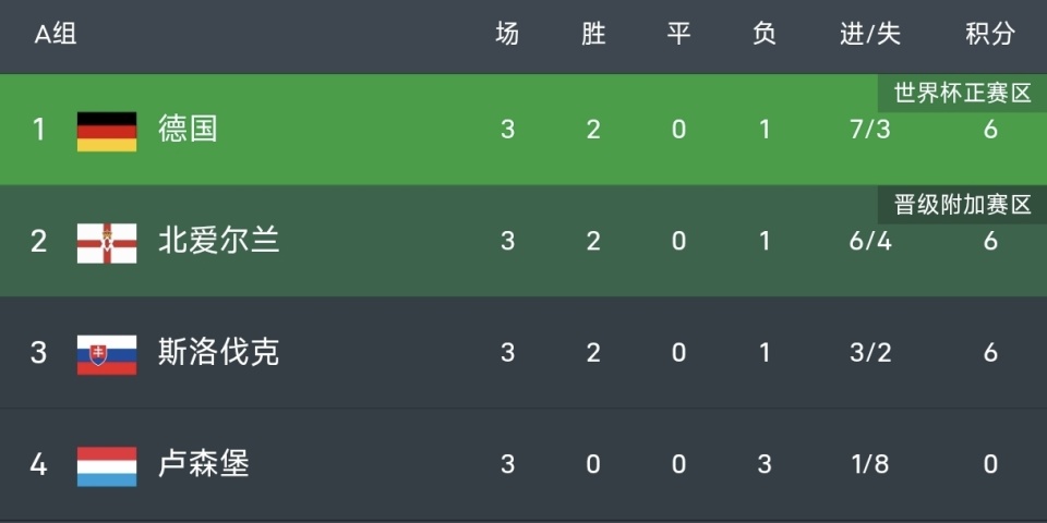德国和北爱尔兰都是2胜1平,同积6分,净胜球多2个,下轮两队将直接较量,胜者基本上就将晋级世界杯。