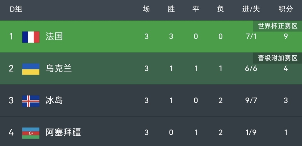 法国3-0阿塞拜疆,乌克兰5-3冰岛