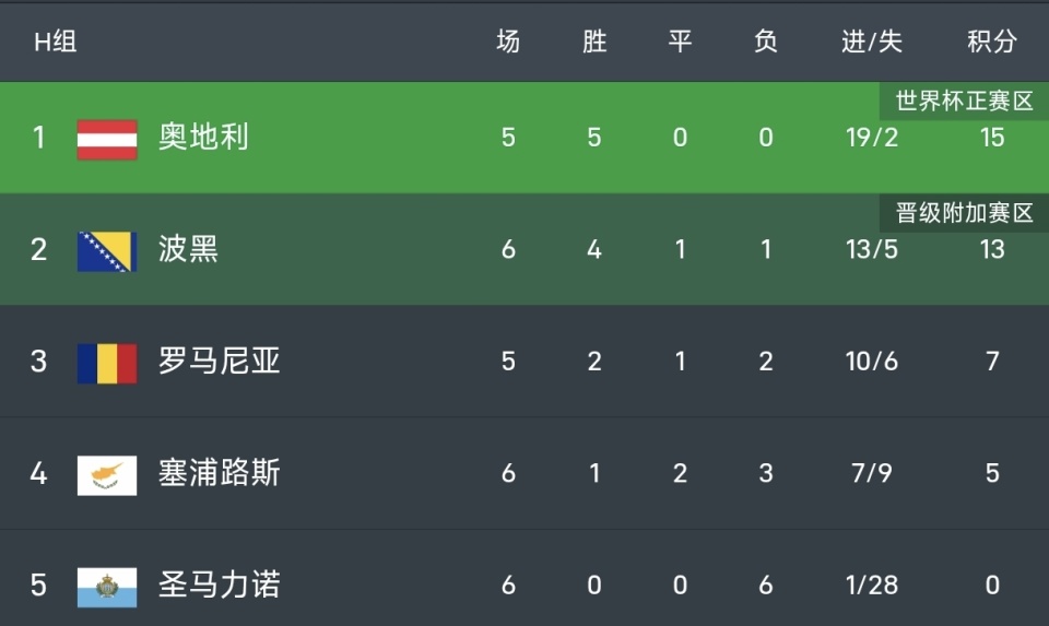 5队小组,奥地利5连胜15分,波黑13分但是多赛1场,所以前者直通世界杯的机会很大。塞浦路斯7分已经提前出局,圣马力诺虽然0分垫底,但可能通过欧国联拿到附加赛门票。