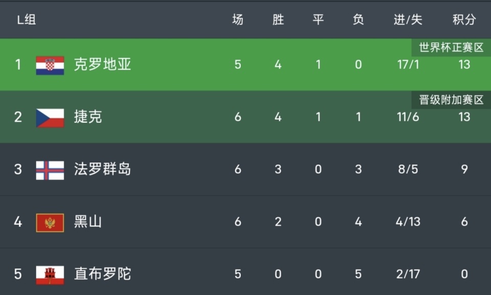 5队小组,克罗地亚和捷克都是13分,前者净胜球多了11个,法罗群岛9分,已经基本没有希望。黑山6分,直布罗陀0分,都彻底出局。