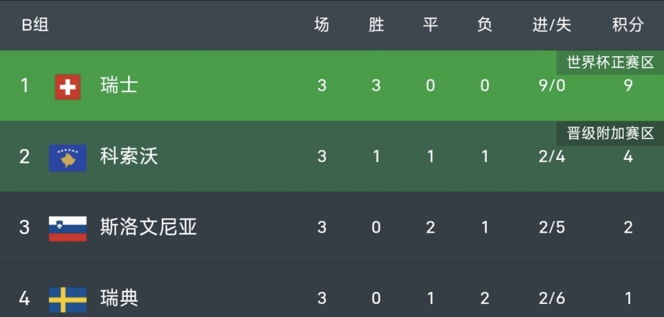 瑞士3战全胜积9分,科索沃1胜1平1负积4分,而瑞典则是3轮不胜+2连败,竟然1分垫底!下轮瑞典将要对阵科索沃,如果还是无法取得首胜,那么不仅无缘世界杯,附加赛的资格都要没戏了。