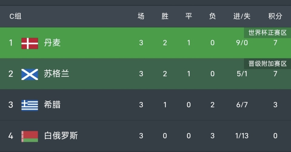 丹麦和苏格兰都是2胜1平,同积7分,前者净胜球多了5个,希腊3分,白俄罗斯垫底。下轮丹麦将对阵希腊,苏格兰迎战白俄罗斯,有望继续赢球。而最后一轮丹麦和苏格兰的直接较量,将决出直通世界杯的名额。