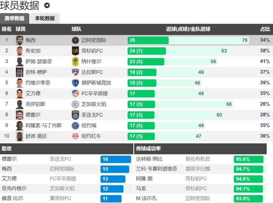 此役2射1传之后,梅西本赛季美职联进球数已经来到了26球,没有点球,以2球的优势领跑美职联射手榜,排名第二的是洛杉矶FC的博安加,打入了24球,但其中7球来自点球;梅西本赛季美职联助攻数已经来到了15次,以1次之差排名美职联助攻榜第二。