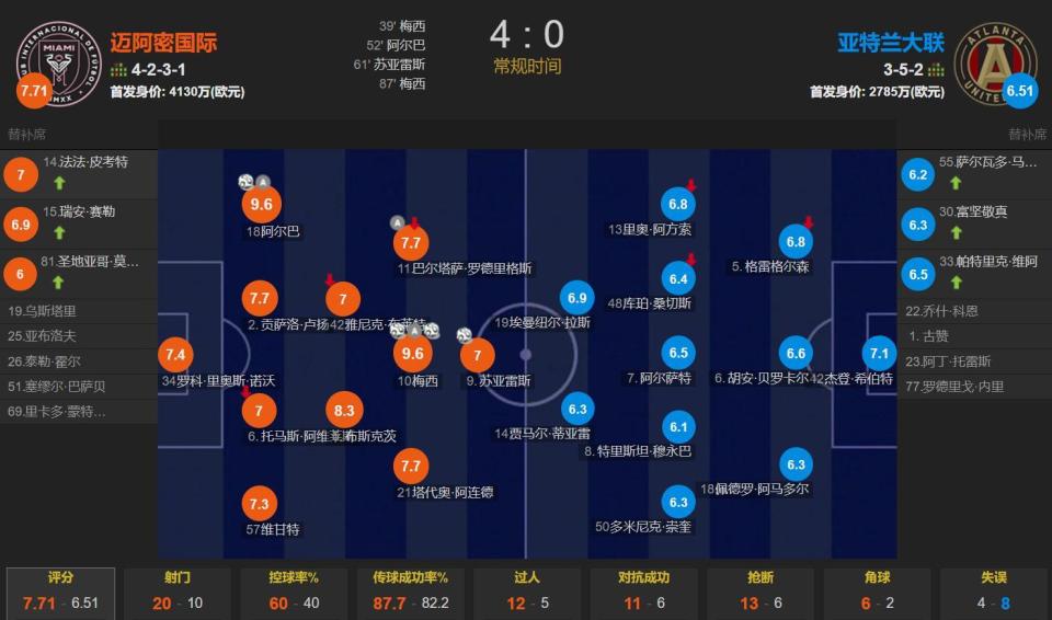 最终,迈阿密国际主场4-0大胜亚特兰大联,距榜首4分。