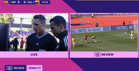 第90+3分钟,贝莱德禁区内倒地判点,哥伦比亚挑战VAR,回看后取消点球判罚