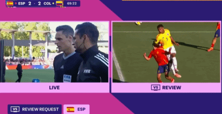第70分钟,西班牙再次挑战VAR,裁判回看后判罚萨拉维亚肘击并出示黄牌