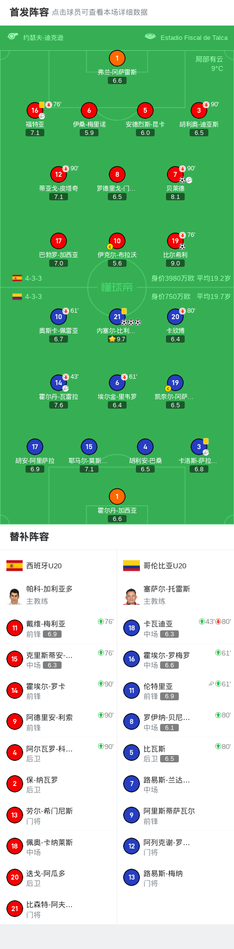 北京时间10月12日U20世界杯 1/4决赛,西班牙U20对阵哥伦比亚U20。西班牙U20贝莱德破门,比尔希利破门。哥伦比亚U20内塞尔-比利亚雷亚尔帽子戏法。最终比分西班牙U20 2-3 哥伦比亚U20。