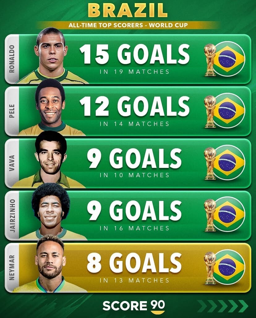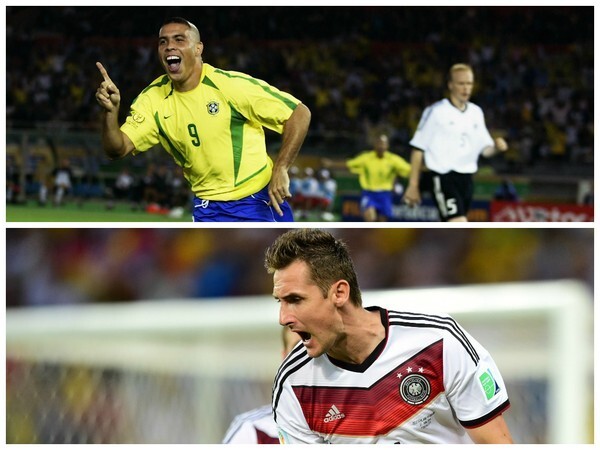 八大国家队世界杯进球榜:克洛泽16球第1,大罗第2,梅西第3