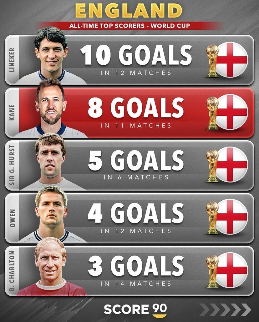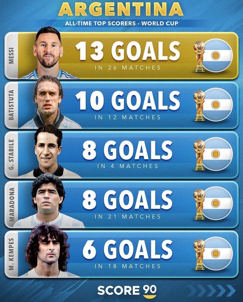 北京时间10月13日,Score 90统计出了法国、阿根廷、葡萄牙、巴西、西班牙、英格兰、德国以及意大利8支国家队的世界杯射手王,其中克洛泽以16球排名所有球员之首,罗纳尔多15球位列第二,梅西与方丹同以13球并列第三位。
