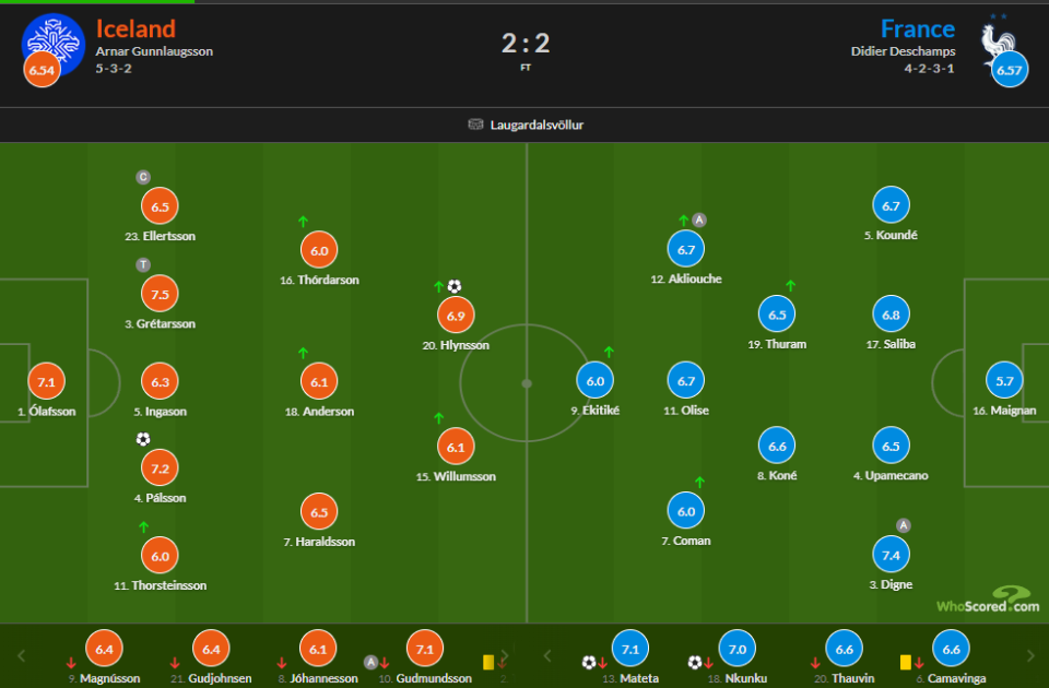 本场比赛帕尔松上半场就帮助冰岛取得领先,虽然恩昆库和马特塔在下半场6分钟之内连入2球,但替补登场的赫林闪电扳平,最终两支球队激战90分钟,2-2握手言和,法国队继续排名D组第一,但是领先的优势已经被乌克兰缩小到了3分。