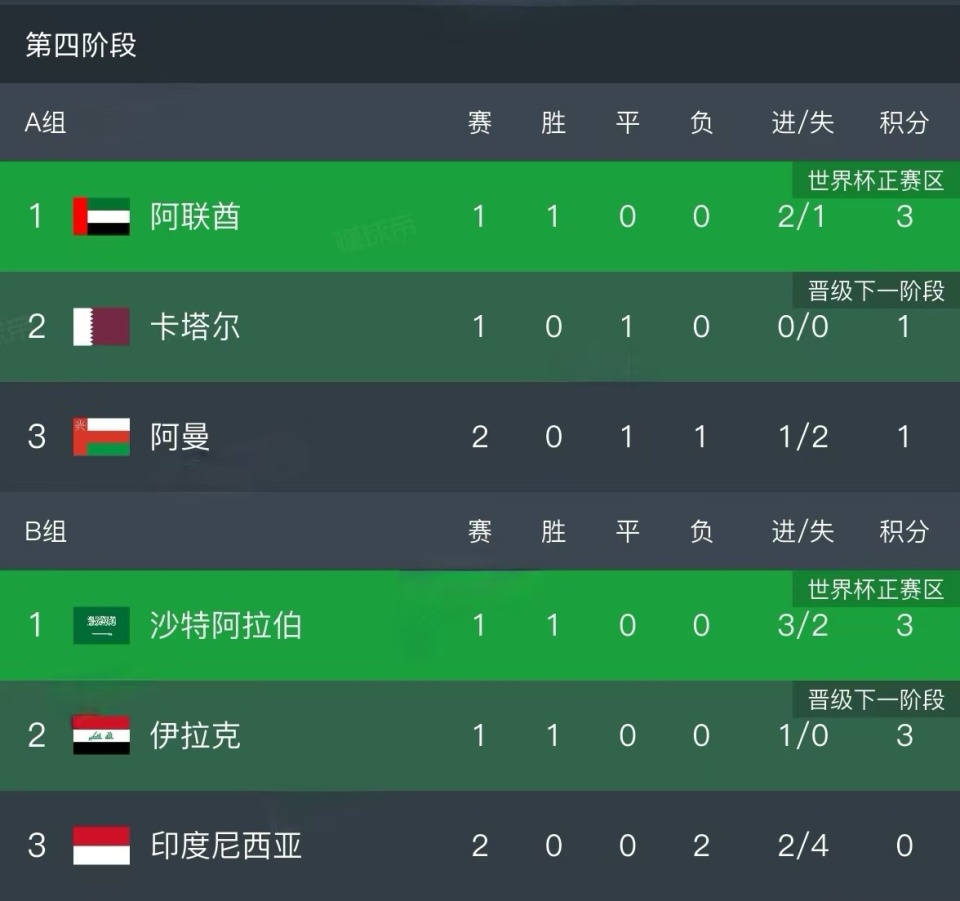世预赛亚洲区第四阶段A组的3支球队分别是阿联酋、卡塔尔和阿曼,首轮阿曼0-0卡塔尔,第二轮阿联酋2-1阿曼,目前阿联酋3分排名小组第一,卡塔尔1分排名第二,阿曼两场比赛只得1分排名垫底,已经提前1轮被淘汰,小组头名将在阿联酋和卡塔尔之间产生。B组的3支球队分别是沙特、印尼和伊拉克,首轮印尼2-3沙特,第二轮伊拉克1-0印尼,目前沙特3分排名小组第一,伊拉克3分排名第二,印尼两场只得0分垫底已经被淘汰,小组头名将在沙特和伊拉克之间产生。