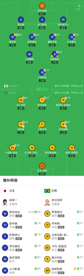 第71分钟,伊东纯也左侧角球开出,上田绮世甩头攻门,再次攻破了桑巴军团的球门,将比分反超为了3-2。