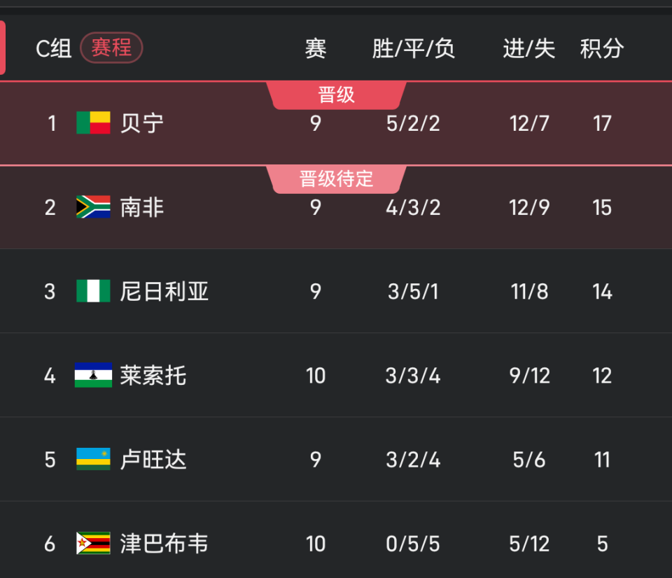 C组,贝宁以17分排名第一,南非15分排名第二,尼日利亚14分排名第三。末轮贝宁和尼日利亚直接相遇,如果贝宁获胜,就将队史首次晋级世界杯。值得一提的是,贝宁世界排名只比国足高1位。