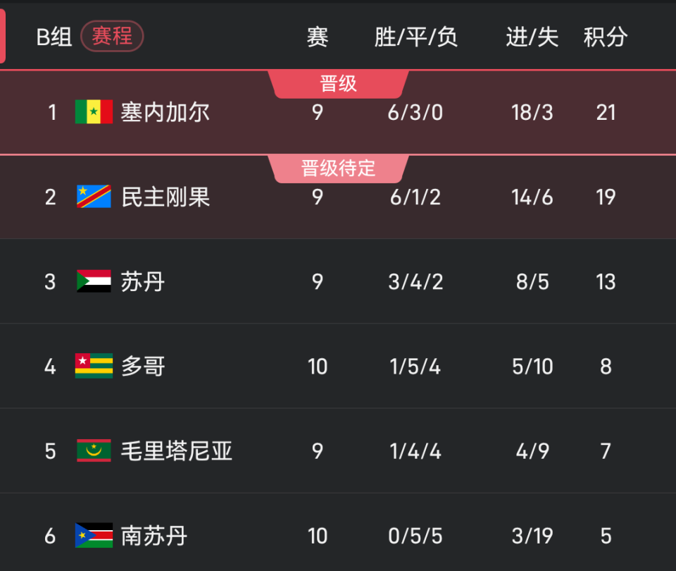 B组,塞内加尔以21分排名第一,民主刚果以19分排名第二。塞内加尔末轮主场面对同组第五毛里塔尼亚,民主刚果主场面对同组第三苏丹。塞内加尔如果取胜,就将确定直通世界杯;而民主刚果要想获得头名,就必须取胜且寄希望于塞内加尔输球。