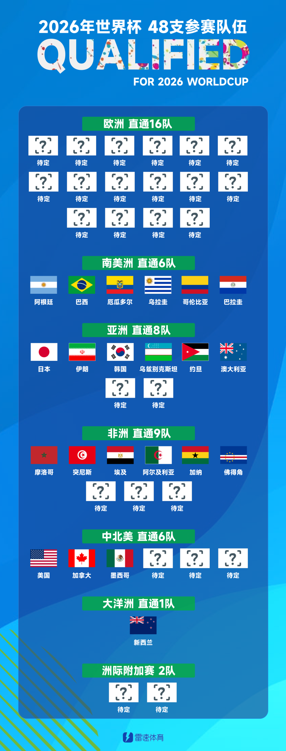 雷速体育10月14日讯 在非洲小国佛得角队史首进世界杯后,2026世界杯48个席位已经锁定22席。今天夜间,世界杯欧洲区、非洲区、亚洲区预选赛都将继续进行。