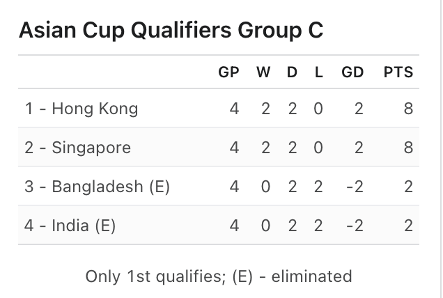 按规则只有小组第1才能晋级亚洲杯,在新加坡和中国香港还有1场对决的情况下,印度已经提前2轮无缘2027年亚洲杯正赛。