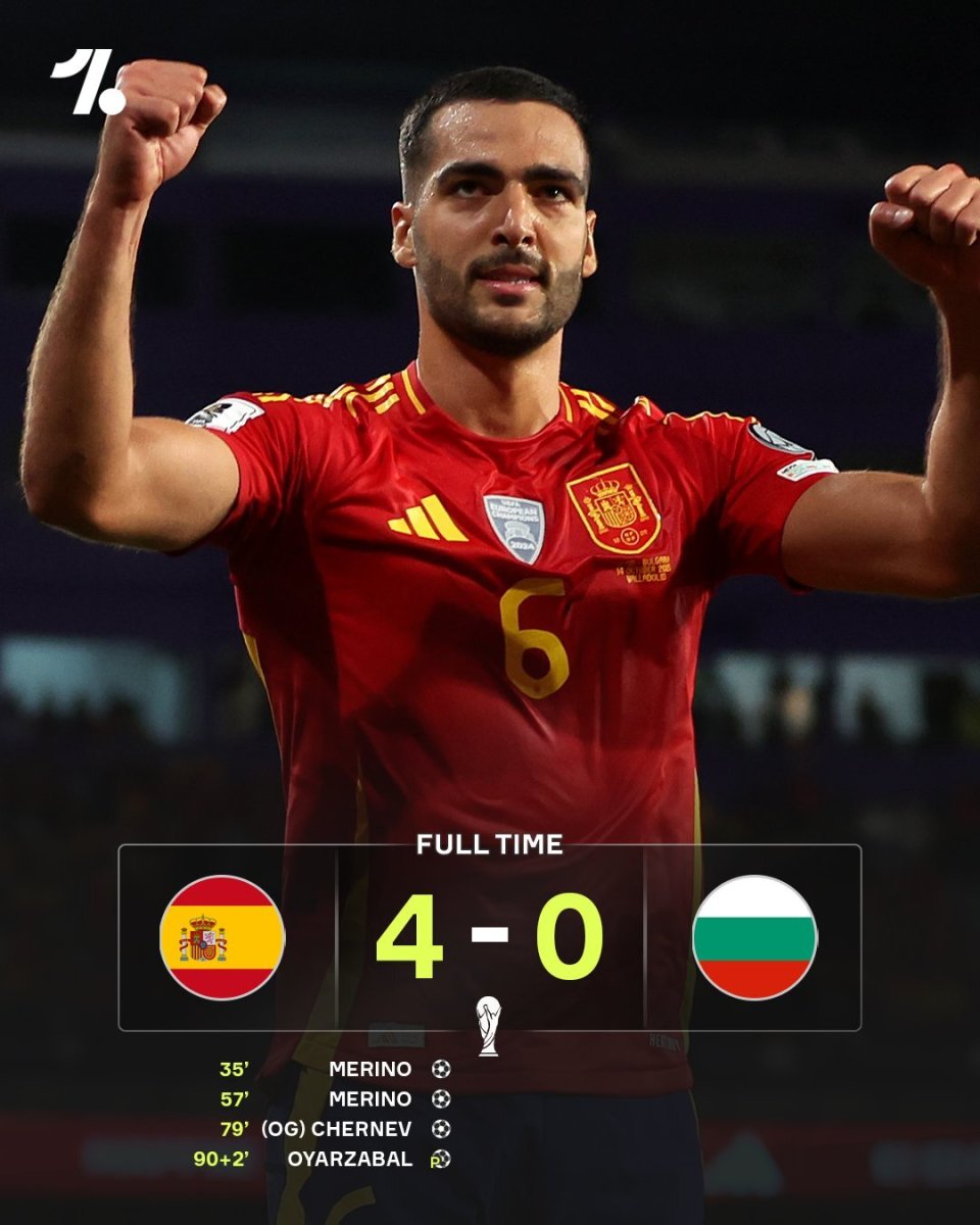 世预赛欧洲区小组赛E组第8轮,西班牙主场4-0大胜保加利亚,4战全胜领跑。梅里诺梅开二度+造点,阿莱克斯-加西亚造成切尔内夫乌龙,奥亚萨瓦尔点射。
