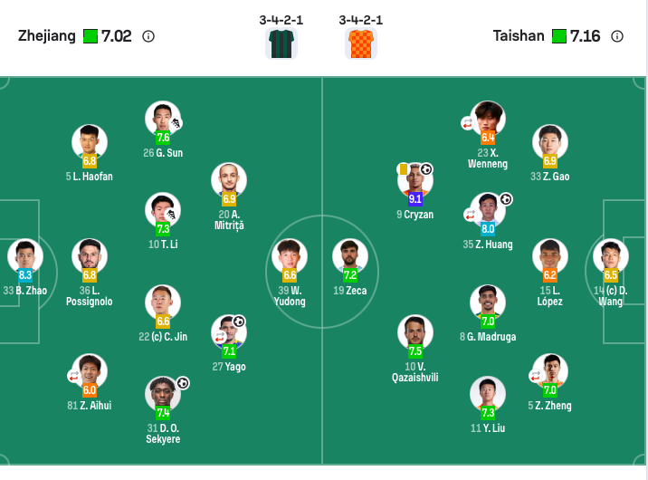 中场:26-孙国文(90’24-汪士钦)、10-李提香、20-米特里策(F)、22-程进、31-奥乌苏(F);