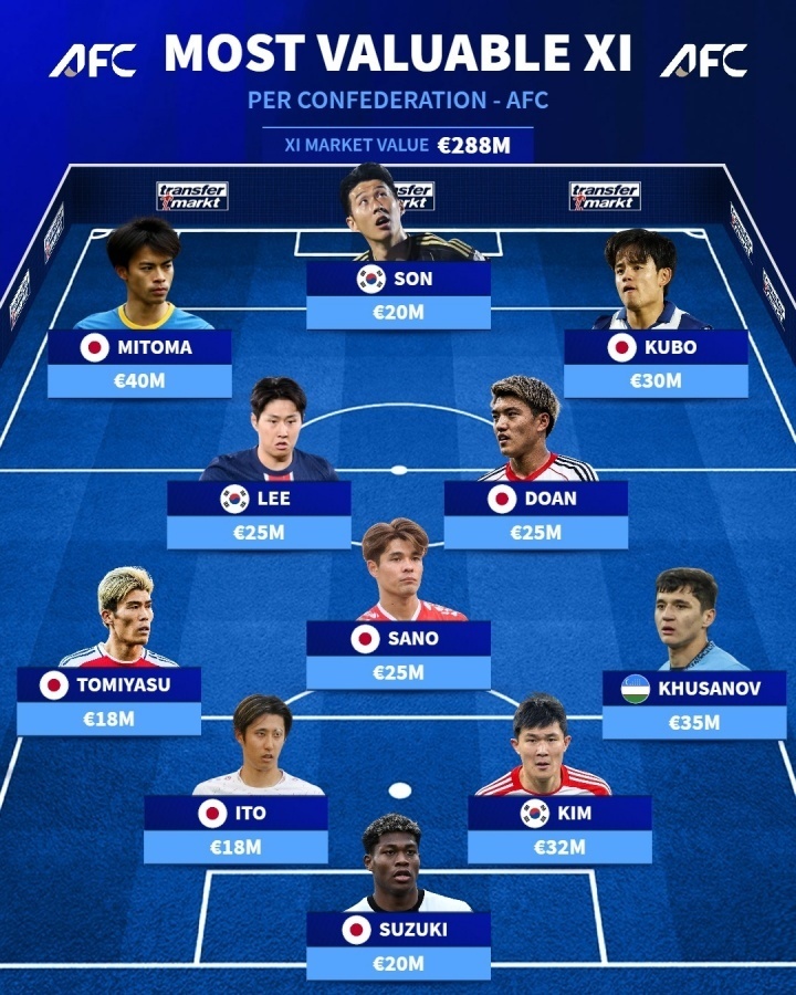 2.88亿欧元!亚洲最贵阵容出炉:日本独占7席,33岁孙兴慜入围
