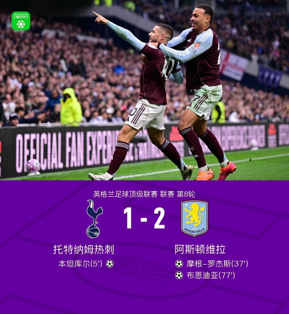 北京时间10月19日,英超联赛第8轮展开较量,托特纳姆热刺坐镇主场迎战阿斯顿维拉。上半场,帕利尼亚助攻本坦库尔闪击破门,摩根-罗杰斯精彩远射扳平比分;下半场,布恩迪亚同样远射破门,帮助维拉实现反超。最终,热刺主场惨遭逆转,1-2不敌维拉。