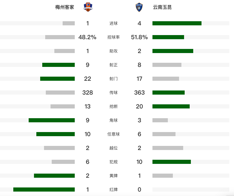 北京时间10月24日晚间,中超第28轮开赛,梅州客家主场迎战云南玉昆。上半场两队互交白卷。下半场,恩里克梅开二度,内内上演贴地斩,迪力穆拉提贡献任意球世界波。第84分钟,替补登场的杨瑞琦扳回一城。补时阶段,茹子楠被红牌罚下。最终,梅州客家主场1-4负于云南玉昆,最近6轮1胜5负,继续排名倒数第三,云南玉昆迎来两连胜。