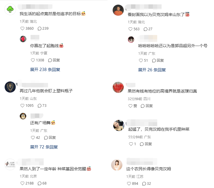 比如:“起猛了,贝克汉姆也到了退休种菜的年龄”;“还以为贝克汉姆来山东了”;“富人的尽头是种菜”;“人到中年血脉觉醒,种种菜养养鸟”……小贝小红书的评论区可以说是热闹非凡~