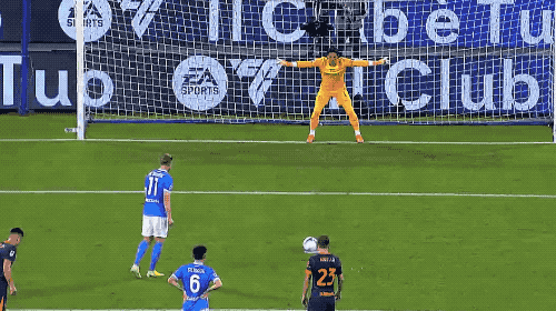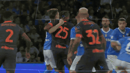 上半场尾声阶段,巴斯托尼和邓弗里斯的头球击中门框,半场结束,那不勒斯1-0暂时领先。