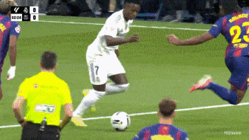 开局阶段,由于皇马也在打着高位压迫,维尼修斯拿球后的冲刺空间总是很小,所以还和孔德有种五五开的感觉。等到阿隆索发现中场绞杀+长距离直塞这招行得通,把控球率主动从五五开迅速放到30%之后,维尼修斯开始频繁单兵爆破。