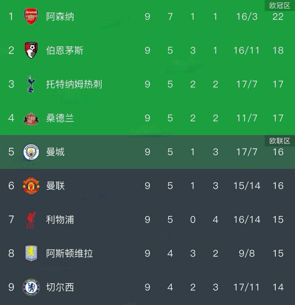 热刺在新帅弗兰克执教下,改掉了上赛季捅对手一刀,被对手反捅两刀,最后同归于尽的惨烈,英超9轮过后以17分排名英超第3。不过热刺在英超9轮中,遇到的强队不多,只有曼城、伯恩茅斯和维拉,而热刺战胜了曼城,输给了伯恩茅斯和维拉,证明了球队依然不够稳定。热刺本赛季依然要拼尽全力,才能够争取前四。