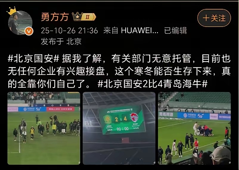 而其实国安还真的是有解散的风险,目前俱乐部正面临巨大危机当中,根据记者勇方方爆料,球队目前爆发危机,有关部门无意托管,且没有任何企业有兴趣接盘。在无人接盘、无部门兜底的情况下,北京国安能否撑过这个冬天都成了未知数。相信对于北京国安球迷来说,虽然在球队成绩不佳时说让球队解散,而这也是气话罢了,如果真的到了解散的地步,相信球迷还是会非常不舍得。