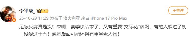 周三,媒体人李平康在社交媒体透露,“足坛反腐真是没结束”,“可能还得有重量级人物”。
