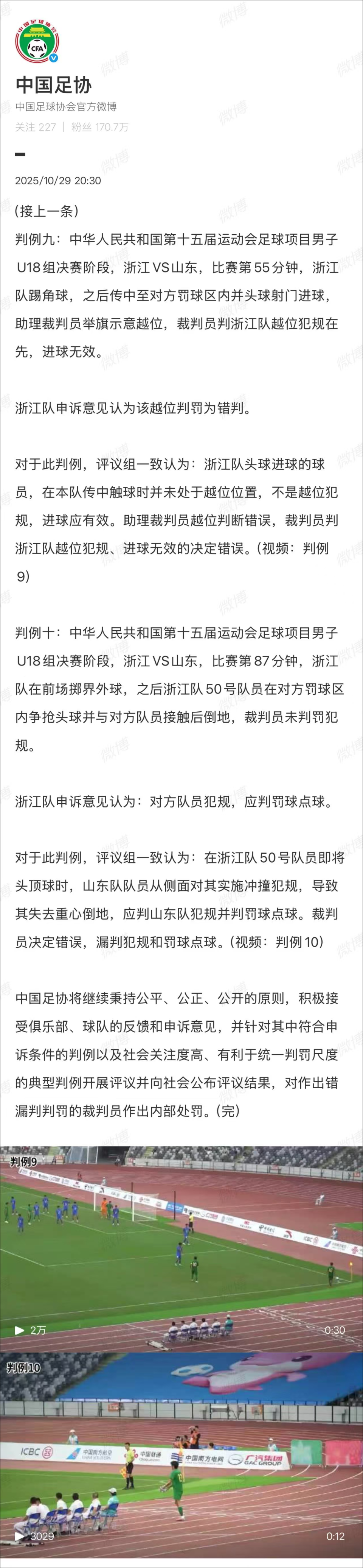 10月29日晚,中国足协发布裁判评议结果,浙江U18对山东队的这场比赛中,浙江U18一个进球被判越位,还有一个点球被漏判……