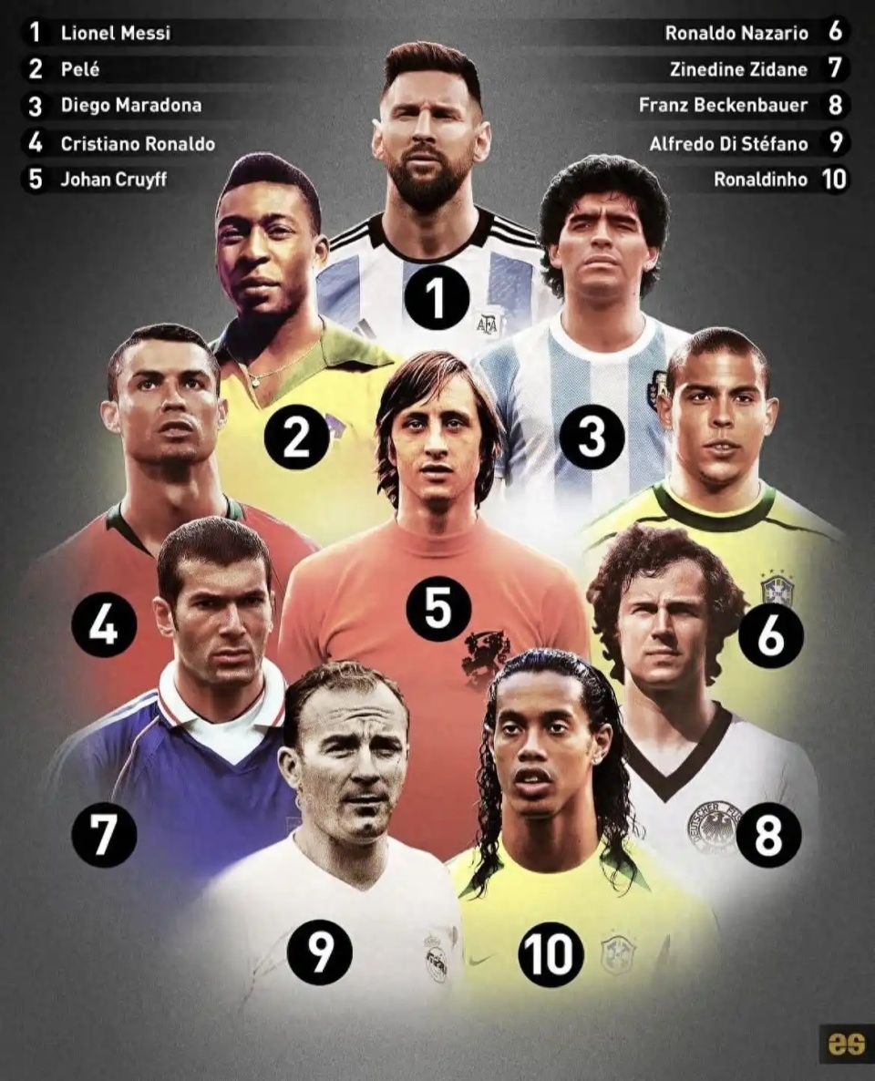 足坛排名:梅西第3、C罗第14、贝利第18、大罗第36、齐达内第46、克林斯曼第57、贝克汉姆第58、托马斯-穆勒第82、鲁尼第89。