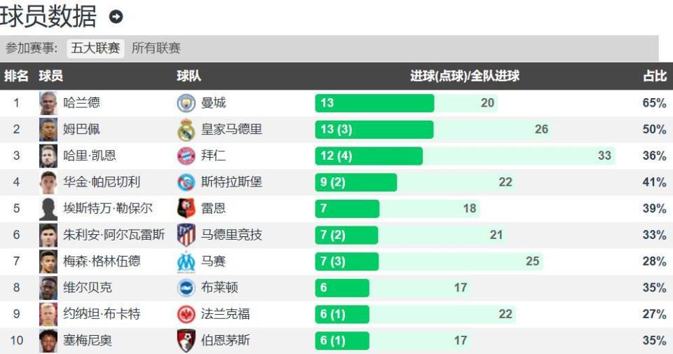 哈兰德、姆巴佩、凯恩本赛季联赛进球数据: