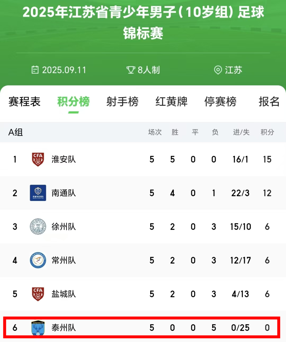 U10组别,泰州队跟淮安、南通、徐州、常州、盐城分在一组。5场比赛进0球,丢25球!