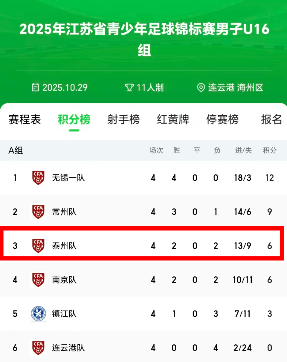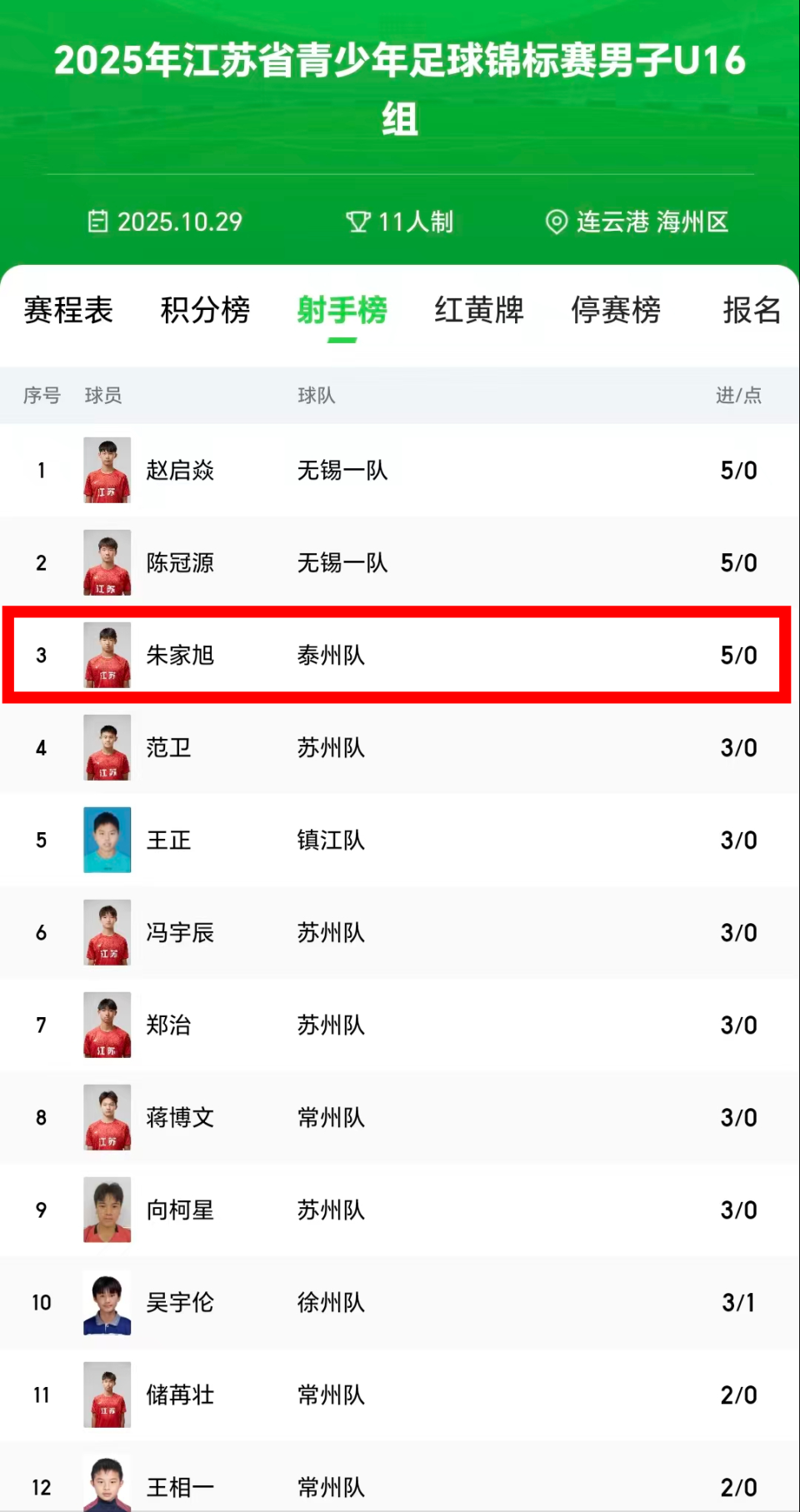 小组首战泰州队1比6惨败无锡一队,次轮则是6球大胜连云港,第三轮5球大胜镇江,四轮1比3负于常州,目前暂列小组第三,朱家旭则以5球并列领跑射手榜!可以说泰州U16算是给泰州糟糕的青训基础挽回了一丝颜面。