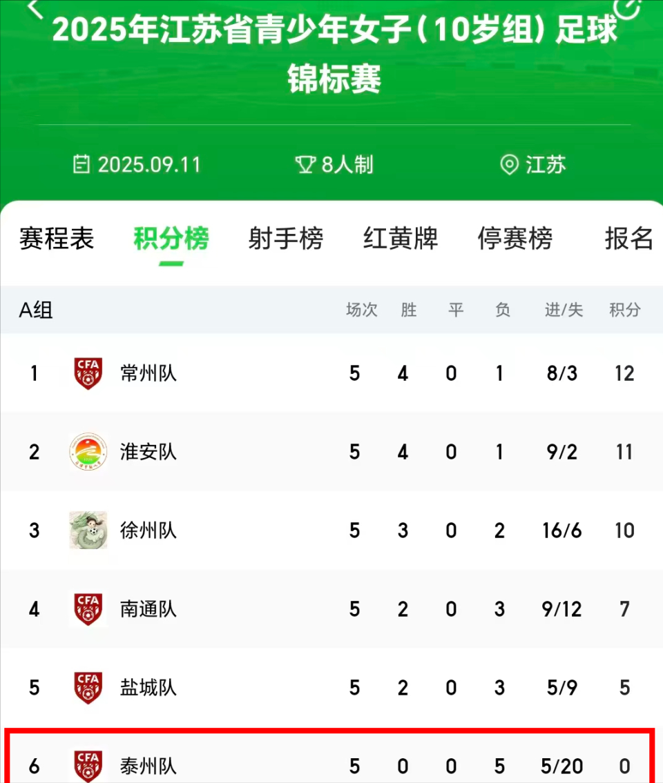 泰州U10女足,跟常州、淮安、徐州、南通、盐城分在一组,5场全败,进5球丢20球。