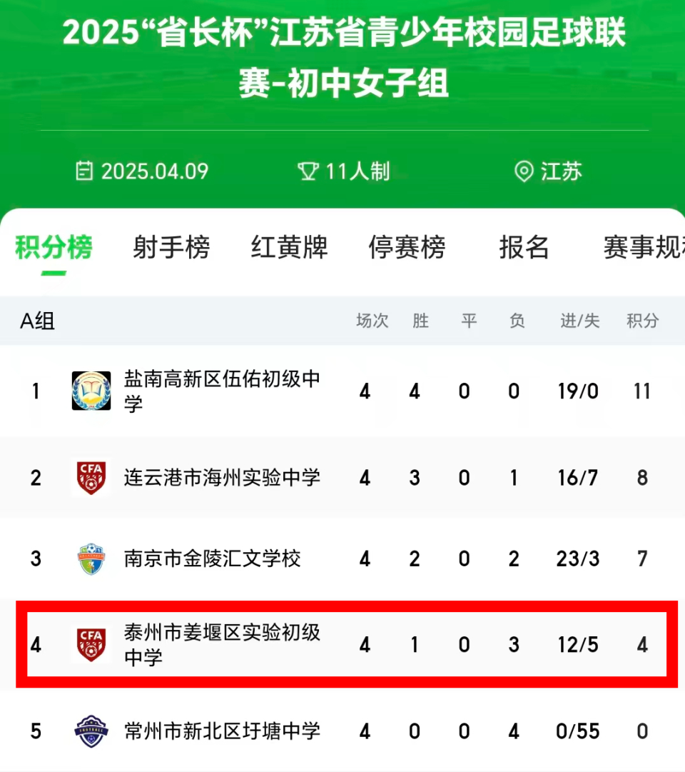 泰州的姜堰实验初中,则参加了省长杯初中女子组。小组赛期间1胜3负排在小组第四;9-16名排位赛,4球完败江阴二中。